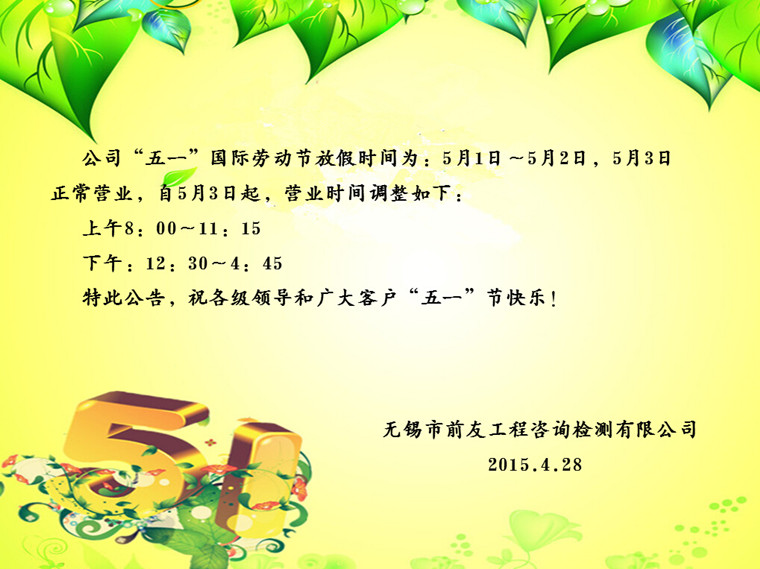 | 關(guān)于“五一”節(jié)放假及節(jié)后營(yíng)業(yè)時(shí)間調(diào)整的公告 | ||