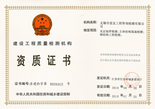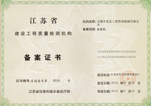 近日,無錫市前友工程咨詢檢測有限公司從江蘇省住房和城鄉(xiāng)建設(shè)廳行政服務(wù)中心領(lǐng)回了嶄新的《建設(shè)工程質(zhì)量檢測機構(gòu)資質(zhì)證書》和《江蘇省建設(shè)工程質(zhì)量檢測機構(gòu)備案證書》。據(jù)此,公司資質(zhì)延續(xù)工作已率先順利完成。 自2006年成立以來,公司在各級主管部門的領(lǐng)導(dǎo)和關(guān)心下,在廣大客戶的支持和配合下,在全體職工的不懈努力下,檢測能力逐步提高,至今,已具備了以下檢測資質(zhì)能力項目: 見證取樣類:水泥物理力學(xué)性能;鋼筋(焊接連接)力學(xué)性能;砂、石常規(guī);混凝土、砂漿強度;簡易土工;混凝土摻加劑(外加劑、粉煤灰);瀝青、瀝青混合料;預(yù)應(yīng)力鋼絞線、錨夾具、金屬螺紋管。 專項檢測類:主體結(jié)構(gòu)工程現(xiàn)場檢測(包括鋼筋保護層、現(xiàn)場強度檢測、結(jié)構(gòu)性能、后置埋件力學(xué)檢測);鋼結(jié)構(gòu)工程檢測(包括鋼結(jié)構(gòu)工程用鋼材、連接件、鋼結(jié)構(gòu)焊縫質(zhì)量、防腐防火涂層、鋼結(jié)構(gòu)變形);建筑節(jié)能檢測(建筑節(jié)能材料檢測、建筑節(jié)能現(xiàn)場檢測和熱工性能現(xiàn)場檢測)。 備案檢測類:室內(nèi)環(huán)境檢測、建筑水電檢測、墻體、屋面材料、飾面材料、防水材料、門窗檢測。 安全檢測類:鋼管、扣件、承插型盤扣式鋼管支架檢測。 測繪類:工程測量、不動產(chǎn)測繪。 其它類:相零線檢測、 截面尺寸檢測(現(xiàn)澆樓板厚度檢測)、室內(nèi)空間尺寸檢測、輕鋼龍骨、石膏板、鋁塑復(fù)合板檢測。
