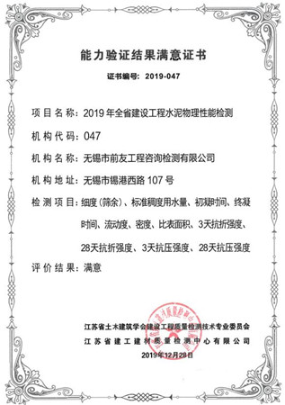 根據(jù)《省住房城鄉(xiāng)建設(shè)廳關(guān)于做好2019年全省建設(shè)工程質(zhì)量檢測能力驗證工作的通知》(蘇建函質(zhì)[2019]354號)要求,江蘇省土木建筑學(xué)會建設(shè)工程質(zhì)量檢測技術(shù)專業(yè)委員會于2019年10月組織了全省建設(shè)工程水泥物理性能檢測能力驗證工作。全省各檢測機構(gòu)參加,項目參數(shù)有:細度、密度、比表面積、流動度、標(biāo)準(zhǔn)稠度用水量、初凝時間、終凝時間、強度(3d、28d)。 近日,省檢測專委會寄來證書,無錫市前友工程咨詢檢測有限公司能力驗證結(jié)果滿意。