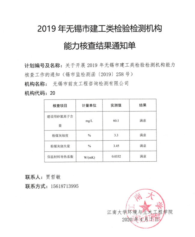 為加強全市建工類檢測機構(gòu)的監(jiān)督管理,2019年四季度,無錫市市場監(jiān)督管理局組織開展了全市建工類檢驗檢測機構(gòu)能力核查,委托江南大學(xué)具體實施。核查項目包括:建設(shè)用砂氯離子含量、粉煤灰細(xì)度、粉煤灰燒失量、保溫材料導(dǎo)熱系數(shù)。 近日,公司收到能力核查結(jié)果通知單。無錫市前友工程咨詢檢測有限公司核查項目結(jié)果全部滿意。