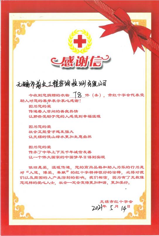 2021年是我們偉大的中國(guó)共產(chǎn)黨建黨100周年,在慶祝黨百年華誕的重大時(shí)刻,在“兩個(gè)一百年”奮斗目標(biāo)歷史交匯的關(guān)鍵節(jié)點(diǎn),無錫市前友工程咨詢檢測(cè)有限公司再次組織愛心衣物捐贈(zèng)活動(dòng),以實(shí)際行動(dòng)獻(xiàn)禮建黨100周年。 此次衣物捐贈(zèng)受益對(duì)象為本市低收入家庭、殘疾人家庭、外來務(wù)工人員、遭遇突發(fā)事件陷入困境的家庭、對(duì)外援助貧困和受災(zāi)地區(qū),因此,本次活動(dòng)得到了公司員工的積極響應(yīng)和大力支持。廣大員工積極踴躍參加,整理家中閑置衣物。此次共收到員工捐贈(zèng)的衣物90余件,從中選擇出符合捐贈(zèng)要求的衣物78件,整理打包后已于5月14日送至市紅十字會(huì)統(tǒng)一捐贈(zèng)。前友的發(fā)展得益于改革開放的偉大時(shí)代,前友人有一顆感恩的心。 本次愛心衣物捐贈(zèng)活動(dòng),激發(fā)了公司員工參與公益事業(yè)、傳遞愛心的熱情,折射出了前友人身上所具有的助人為樂、無私奉獻(xiàn)的良好品格,彰顯了公司的社會(huì)責(zé)任感。讓我們繼續(xù)為愛助力,為實(shí)現(xiàn)中華民族兩個(gè)一百年的宏偉目標(biāo)努力工作,付出自己的微薄之力。