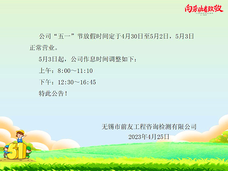 | 關于“五一”勞動節(jié)放假及節(jié)后營業(yè)時間調(diào)整的公告 | ||