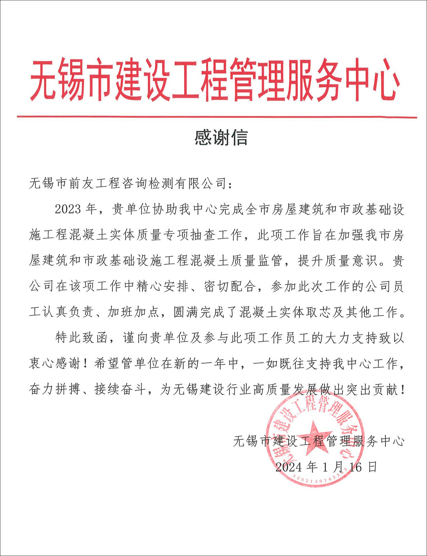 近日,公司收到無錫市建設(shè)工程管理服務(wù)中心感謝信。 2024.1.17 | ||