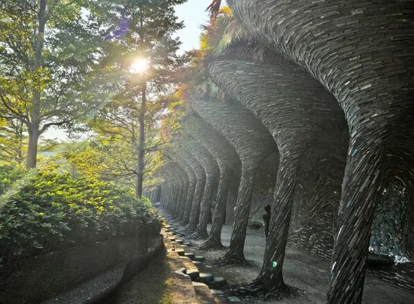 建造過程是工匠精神的全面體現(xiàn),建設(shè)方對(duì)工期無要求,工程于2007年設(shè)計(jì),2009年初開工,2021年底竣工,整體施工過程歷時(shí)13年。工程運(yùn)用自然界的各種生物形態(tài),如植物根莖、葉片和動(dòng)物羽毛等元素豐富設(shè)計(jì)創(chuàng)作,樹冠般的屋檐、藤蔓般的石壁、叢林般的空間結(jié)構(gòu)使得建筑具有嚴(yán)謹(jǐn)邏輯次序的同時(shí),又富質(zhì)感與動(dòng)態(tài)感,流動(dòng)與呼吸的感覺在石墻石柱間彌散,回收的天然石材、磚塊和廢棄的碎瓷片重塑后獲得了新的生命力量。大量的弧線、拱形、雙曲面等結(jié)構(gòu)元素,隨處可見的回收舊材再創(chuàng)作,彰顯其對(duì)手工藝復(fù)興及環(huán)境可持續(xù)發(fā)展的理念。該工程先后克服諸多力學(xué)、仿生學(xué)、綠色技術(shù)、施工工藝難點(diǎn)等,單個(gè)工程就創(chuàng)出9項(xiàng)國家發(fā)明專利和35項(xiàng)實(shí)用新型專利。