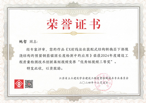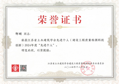 12月5日,第六屆全省建設工程質(zhì)量檢測技術(shù)研討會暨江蘇省土木建筑學會建設工程質(zhì)量檢測技術(shù)專業(yè)委員會2024年年會在南京召開。省、市建設行業(yè)行政主管部門領導、省土木建筑學會領導、專委會委員及會員代表近200人參加會議。 會議主題:守正創(chuàng)新,智慧未來。主要內(nèi)容:江蘇省土木建筑學會建設工程質(zhì)量檢測技術(shù)專業(yè)委員會2024年度工作總結(jié);江蘇省土木建筑學會先進集體(建設工程質(zhì)量檢測科技創(chuàng)新)、先進個人(建設工程質(zhì)量檢測科技創(chuàng)新)表彰;優(yōu)秀論文表彰;創(chuàng)新成果短視頻表彰;專家學術(shù)報告及檢測機構(gòu)經(jīng)驗交流等。 無錫市前友工程咨詢檢測有限公司獲江蘇省土木建筑學會(建設工程質(zhì)量檢測科技創(chuàng)新)先進集體和短視頻競賽“優(yōu)秀組織獎”。鄒明研究員級高工獲(建設工程質(zhì)量檢測科技創(chuàng)新)先進個人,鮑哲高工獲2024年度建設工程質(zhì)量檢測技術(shù)創(chuàng)新成果短視頻競賽“優(yōu)秀短視頻三等獎”。