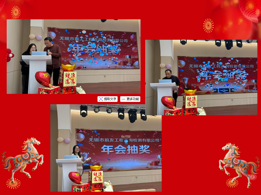 金蛇銜福辭舊歲,駿馬奔騰賀新春。2月12日,馬年新春佳節(jié)即將來(lái)臨之際,無(wú)錫市前友工程咨詢檢測(cè)有限公司全體員工伴隨著歡快的樂(lè)曲歡聚一堂,共憶過(guò)往耕耘,共話未來(lái)愿景,共度一段溫馨而熱烈的美好時(shí)光。 年會(huì)上,公司總經(jīng)理鄒佳樺發(fā)表了新春致辭,向全體員工送上新春的美好祝福與誠(chéng)摯感謝。2025年,憑借全體員工的持續(xù)努力,公司榮獲了江蘇省專精特新中小企業(yè)、無(wú)錫市模架協(xié)會(huì)優(yōu)秀企業(yè)、江蘇省建設(shè)工程質(zhì)量檢測(cè)技術(shù)創(chuàng)新論文一等獎(jiǎng)以及無(wú)錫碩放機(jī)場(chǎng)改擴(kuò)建工程2025年度勞動(dòng)競(jìng)賽先進(jìn)單位等榮譽(yù),充分展現(xiàn)了公司的市場(chǎng)競(jìng)爭(zhēng)力與企業(yè)形象。 致辭結(jié)束后,年會(huì)進(jìn)入最令人期待的抽獎(jiǎng)環(huán)節(jié),現(xiàn)場(chǎng)氛圍瞬間被推向高潮。伴隨一次次開獎(jiǎng),現(xiàn)場(chǎng)掌聲與歡呼聲此起彼伏,每份獎(jiǎng)品都飽含公司對(duì)員工的關(guān)懷之情,也寄托著對(duì)新一年的美好祝愿。員工們陸續(xù)登臺(tái)獻(xiàn)唱,以歌聲和笑聲傳達(dá)馬年的快樂(lè)與祝福,彰顯前友員工積極向上的精神面貌。現(xiàn)場(chǎng)氣氛異常熱烈,鄒總臨時(shí)決定增設(shè)一個(gè)一等獎(jiǎng)的抽獎(jiǎng)名額,這一突如其來(lái)的好消息瞬間引爆全場(chǎng)。公司多年積淀的企業(yè)文化,已將前友員工緊密相連,匯聚成一個(gè)生機(jī)勃勃、溫情滿滿的幸福大家庭,杯盞交錯(cuò)間,暖流涌動(dòng),歡樂(lè)的氛圍持續(xù)整場(chǎng)晚會(huì)。 伴著歡聲笑語(yǔ)慢慢消散,2025年也完美畫上句點(diǎn)。舊歲已展千重錦,新年再進(jìn)百尺竿。2026馬年新征程已然開啟,前友人將懷揣更加熾熱的激情,秉持更加堅(jiān)定的信念,策馬揚(yáng)鞭、奮勇爭(zhēng)先,昂首闊步踏上新的奮斗征程,共同書寫公司高質(zhì)量發(fā)展的新篇章!